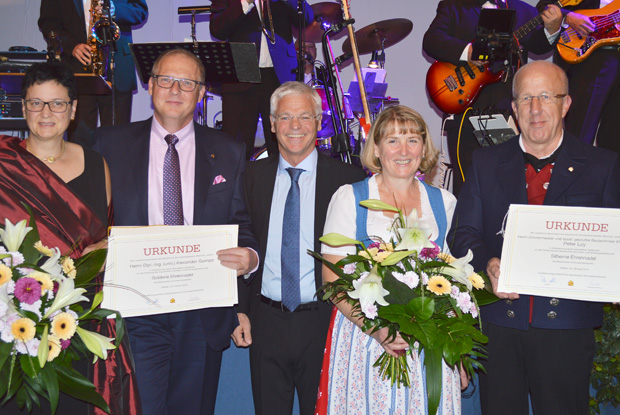 Bayerns Zimmererpräsident Peter Aicher (Mitte) zeichnete Alexander Gumpp (2. v.l.) und Peter Loy (rechts) für ihre Verdienste um den Holzbau aus. Ihre Frauen erhielten Blumensträuße.